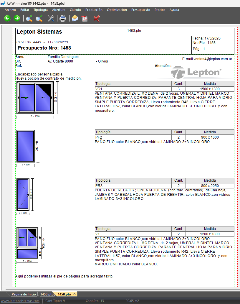 Esta herramienta permite generar de forma automática un documento claro y profesional a partir del presupuesto, incluyendo el detalle de tipologías, cantidades, medidas y descripciones técnicas de cada ítem. Su objetivo es formalizar la etapa de relevamiento con el cliente final, reduciendo errores y mejorando la trazabilidad de la información antes de la producción.