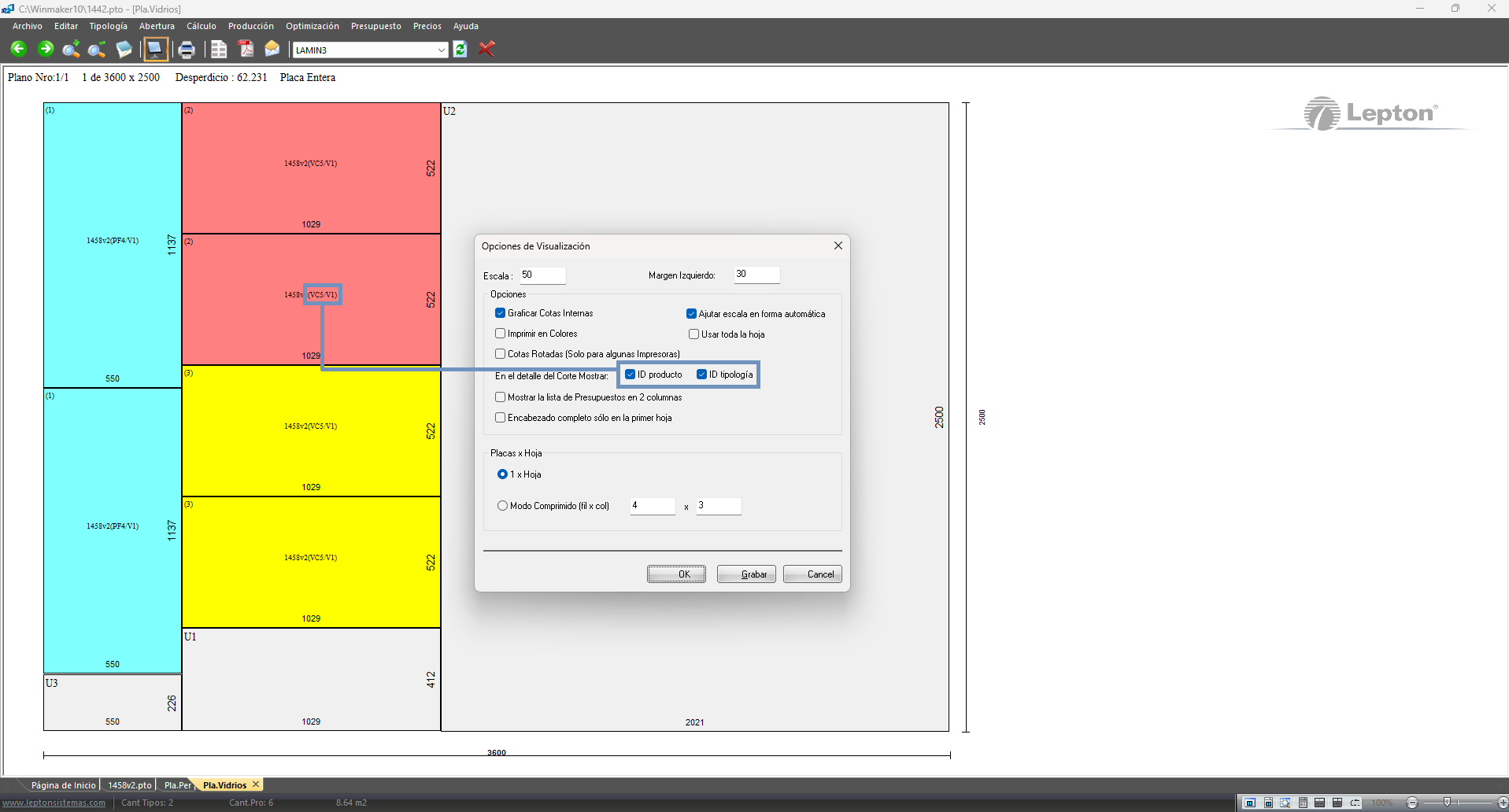 Se amplió la información visible en los planos de optimización de vidrio para incluir el identificador de la tipología junto al producto. Esta mejora resulta especialmente útil en tipologías compuestas, donde ahora es más sencillo vincular cada pieza optimizada con su diseño original y mantener coherencia entre plano, etiquetas y documentación técnica.