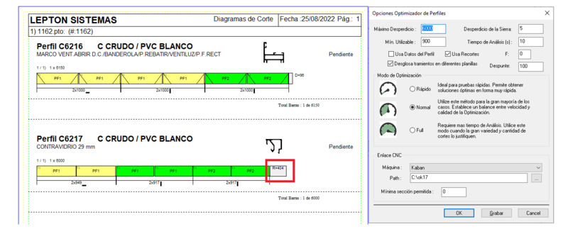 El Winmaker tiene mejorados los algoritmos de optimización para forzar el uso de recortes (en los casos en que se maneja stock). Funcionamiento: los parámetros de optimización Min. Util. y Max Desp. se configuran en las opciones del optimizador, sea que use datos de perfil o no, es decir se usan a los efectos del algoritmo de optimización. Pero luego una vez optimizado, para dibujar la planilla y actualizar el stock el programa toma los datos del perfil propiamente dicho para determinar en cada caso si es desperdicio o sobrante utilizable.