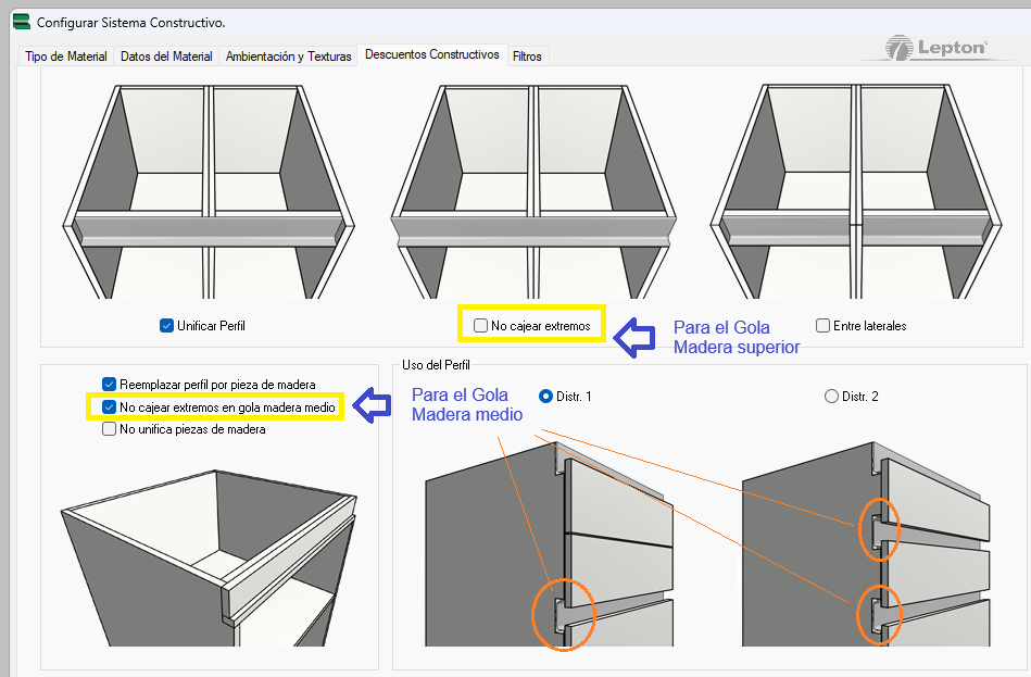 Se realizaron mejoras en el comportamiento de perfiles gola madera en configuraciones con cajones internos.